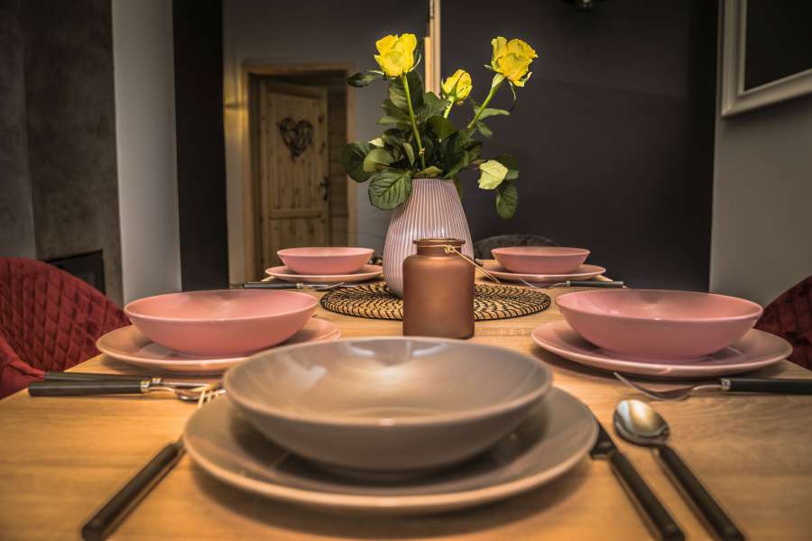Kuchnia jest w pełni wyposażona: płyta indukcyjna, piekarnik, zmywarka, lodówka, czajnik elektryczny, okap, garnki, sztućce, talerze, kubki, kieliszki oraz szklanki.